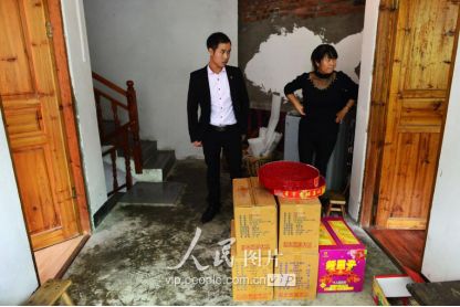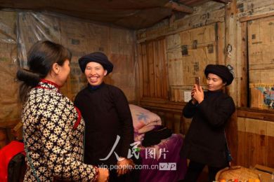 一般要到快過春節(jié)的時候,男方家才專門請人去接女方來洗糯米、打糍粑,新娘方能在夫家住上一夜;在來年農(nóng)忙時節(jié),又接女方來幫忙,夜里仍不能在男方家留宿,幫完忙當(dāng)晚即回去,只有待到女方有身孕后,新娘才到夫家長住。圖為11月16日夜,新娘潘芝銀家為準(zhǔn)備婚禮,燈火徹夜長明。