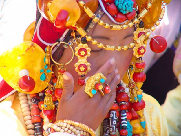 女子頭上一般梳三四十條小細(xì)辮辮,收攏的辮梢上綴有珠寶和彩色絲穗,再戴上以琥珀球?yàn)橹鳎ù鲉尾淮麟p),配以紅珊瑚。綠松石等珠寶的頭飾,華麗而高貴。