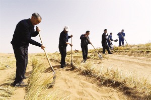 沒有治沙經(jīng)驗(yàn),他們就按“一步一叩首,一苗一瓢水”的土辦法栽種樹苗。然而,要想在沙漠中種活一棵樹談何容易?第一年,“六老漢”造林1萬畝,轉(zhuǎn)過年一開春,一場大風(fēng)過后,六七成的樹苗沒了。在林業(yè)技術(shù)人員的指導(dǎo)下,“六老漢”重拾信心,總結(jié)出“一棵樹,一把草,壓住沙子防風(fēng)掏”的治沙經(jīng)驗(yàn)。慢慢地,樹苗的成活率上去了,漫天黃沙中顯現(xiàn)出點(diǎn)點(diǎn)滴滴的綠。