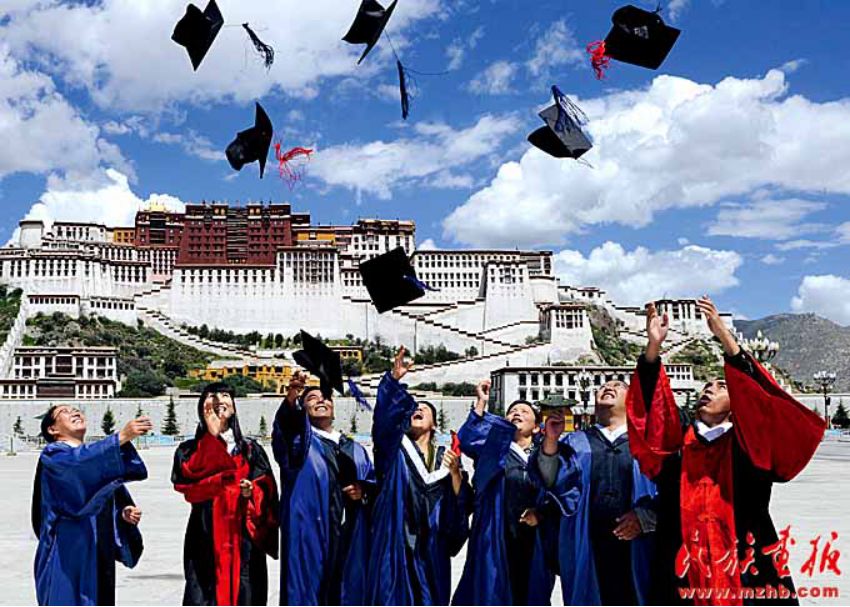 西藏已有普通本??茖W(xué)校7所。西藏大學(xué)一批被授予博士、碩士學(xué)位的學(xué)生在布達(dá)拉宮廣場慶祝畢業(yè)