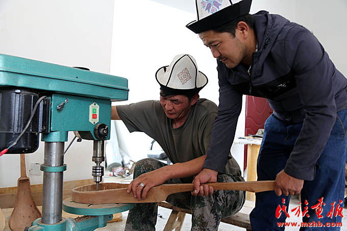 這間工作室的主人叫阿吉別克·買買達(dá)洪,主人恰巧有事外出,他的弟弟,年輕朝氣的吾蘭別克張羅著給記者們當(dāng)起了翻譯。正忙活著打磨樂器的小伙叫木沙,今年31歲,問起庫姆孜的制作工藝,他才把頭抬起來,笑著說:“我做這個十年了。一把庫姆孜,往往琴身是杏木,蓋子是松木。杏樹、松樹木切割后放在干燥的地方,一兩年后才能用。”庫姆孜有三根弦,琴弦以前用動物的腸子手工自制,現(xiàn)在有的工匠開始使用現(xiàn)成的弦。判斷庫姆孜手工藝人手藝高低的關(guān)鍵何在?木沙解釋說,“要看彈出來的聲音。木頭的原料不同,出來的聲音也不同?!边@個回答似乎也隱藏了手工藝人的絕活所在,可意會不可言傳的技藝,往往在一代代的工匠手中以師徒親授的方式傳承。