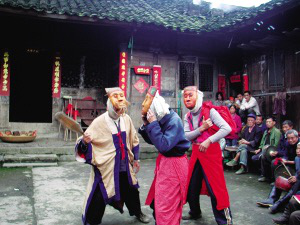 土家族陽(yáng)戲在貴州、湖南、重慶等省、市都有流傳,湖南省張家界陽(yáng)戲和重慶酉陽(yáng)陽(yáng)戲均被列入了省級(jí)非物質(zhì)文化遺產(chǎn)名錄,得到保護(hù)和重視。貴州沿河土家族自治縣的土家族陽(yáng)戲同樣古樸而充滿(mǎn)風(fēng)韻,5月19日,當(dāng)?shù)氐囊慌幕ぷ髡邤M通過(guò)挖掘整理,把獨(dú)具地方特色的面具陽(yáng)戲申報(bào)為省級(jí)非物質(zhì)文化遺產(chǎn),希望沿河陽(yáng)戲同樣受到重視和保護(hù)。