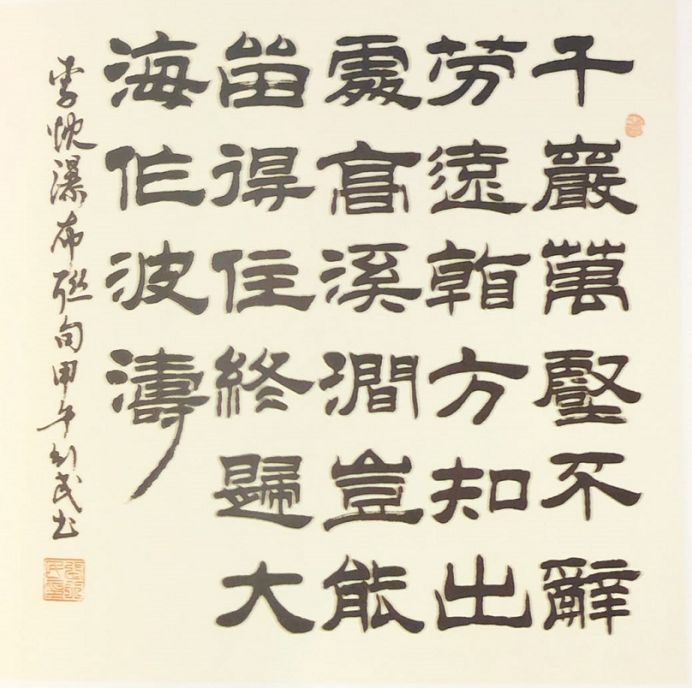 張行民的書法作品博覽眾家之長(zhǎng),悉心揣摩隸書之要義,領(lǐng)悟其精髓,加入其心志與感悟,漸漸形成了自己的風(fēng)格。他的作品灑脫飄逸,體骨厚重,參合有各派書體的筆意,同時(shí)又有自己個(gè)性和意境的張揚(yáng),字體端莊英武,體象收放凝度。賞其書法,總能給我們一種“渾然陣列,筋道玉骨”的美感,實(shí)屬不可多得。