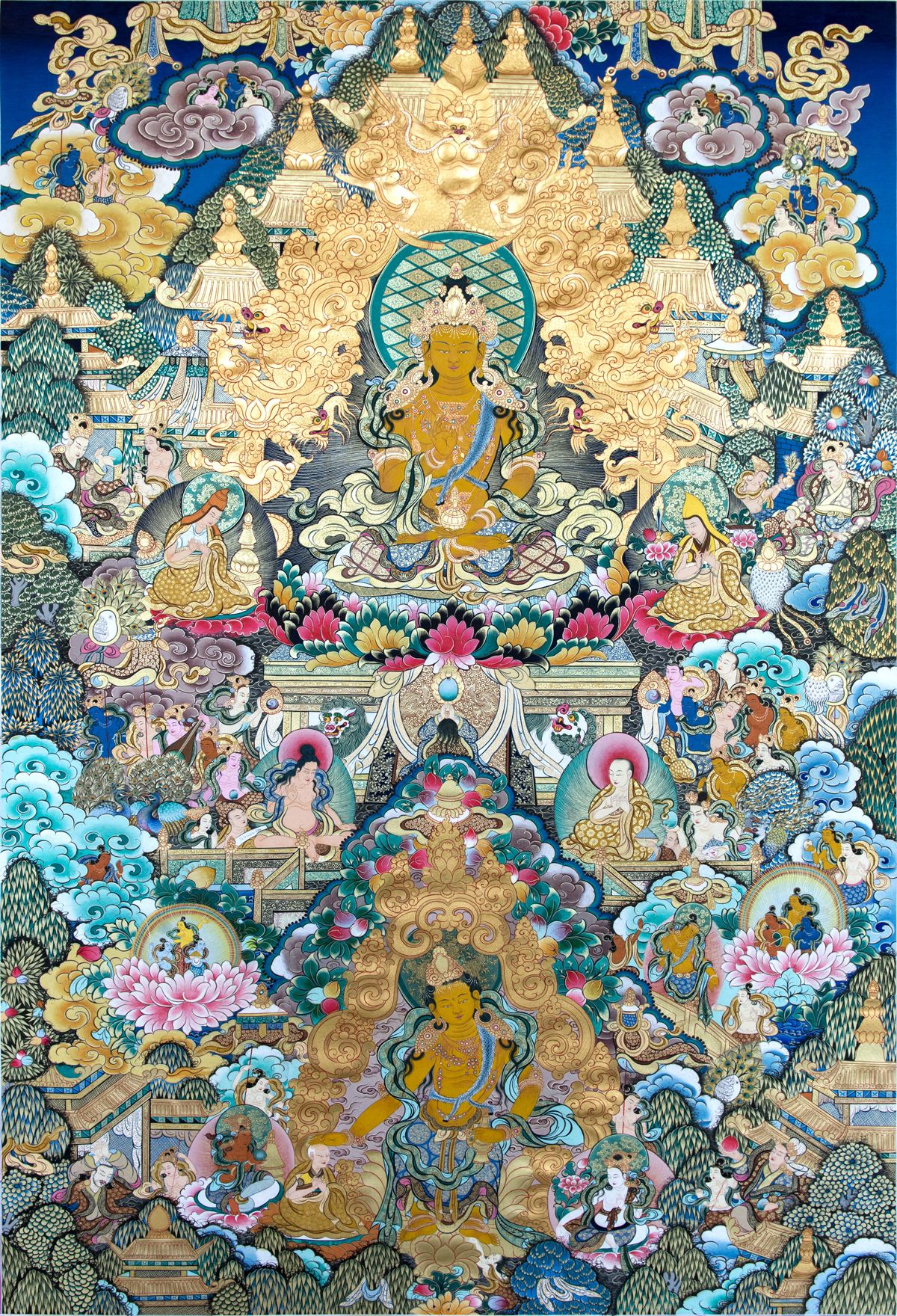 主尊未來(lái)世界彌勒佛菩薩,左邊描繪了噶當(dāng)派創(chuàng)世者阿底峽尊者與他的弟子。右邊描繪了格魯派的創(chuàng)世者宗喀巴大師與兩大弟子克主杰和迦側(cè)杰,中部周圍供奉者八大隨喜菩薩文殊菩薩、普賢菩薩、觀世音菩薩、金剛手菩薩、虛空藏菩薩、地藏菩薩、彌勒菩薩、除蓋障菩薩,畫(huà)面四角供奉為彌勒佛未來(lái)世界的迎接與弘揚(yáng)佛法的情景。畫(huà)面上空描繪了仙女四處飛揚(yáng),空中漂浮著吉祥的圖案與神秘的瑞相等等。整體畫(huà)完之后選擇一個(gè)殊勝吉祥的日子點(diǎn)所有諸佛的五官,發(fā)髻、手勢(shì)、法器、畫(huà)面后部畫(huà)家要親自寫(xiě)聲、語(yǔ)、法的字號(hào)。作品完工之后寺院里進(jìn)行眾多活佛和高僧大德的加持與開(kāi)光儀式。