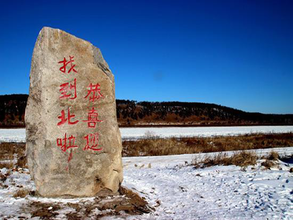 沿著形態(tài)各異的“北”字,可以走到中國最北端的廣場——北望埡口。“東經(jīng)122°20'43。48〃E北緯53°29'52。28〃N”的標(biāo)志就立在這里,旁邊一塊巨石上刻著“中國北極點”。