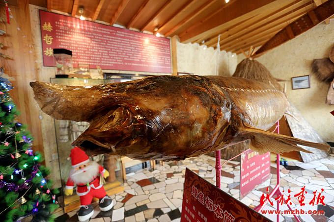 赫哲人把餐廳開到了京城,成為向外界展示赫哲族文化的窗口。圖為赫哲族餐廳內(nèi)57歲的大鰉魚標本,體長2.5米,重達286斤(陳濤 攝影)