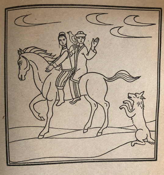 汗想坐得靠近那個(gè)美女一點(diǎn)兒,可是,他剛往前一湊,美女一下子變成了狼,上去把汗抓了個(gè)頭破血流,然后很快地跑掉了。狼又從后面趕上了少年和那位姑娘。少年又對狼說:“我也不想跟這匹馬分開了,能不能想個(gè)辦法呢?”狼說:“可以?!痹诨氐降谝粋€(gè)汗的附近時(shí),狼又搖身一變,變成了一匹駿馬。少年?duì)恐E馬送到汗那里。汗回謝以后,就給了他那只金絲鳥。少年帶著金絲鳥和姑娘一起騎上馬又走了。