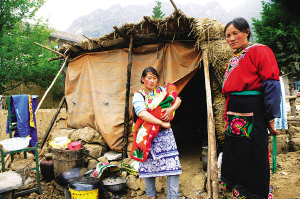 蘿卜寨的楊芝群抱著剛出生3個月的嬰兒在自建的地震棚前