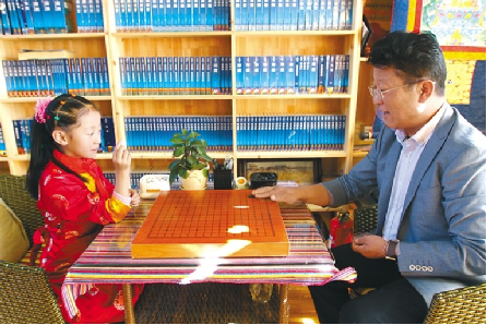 西藏自治區(qū)藏棋協(xié)會(huì)秘書長阿旺邊巴正在與孩子下棋。