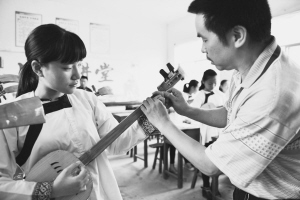 圖為一位音樂教師在指導(dǎo)學(xué)生調(diào)試侗族琵琶。 王炳真攝影報(bào)道