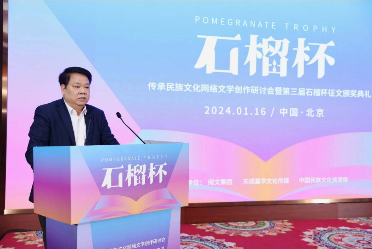 中國(guó)作家協(xié)會(huì)副主席白庚勝在致辭中表示,網(wǎng)絡(luò)文學(xué)是一種趨勢(shì)和方向,是自《詩(shī)經(jīng)》以來(lái)的最偉大的民間文學(xué)的興盛。2023年6月2日,習(xí)近平總書(shū)記在文化傳承發(fā)展座談會(huì)上發(fā)表重要講話,明確提出新時(shí)代的文化使命是“在新的起點(diǎn)上繼續(xù)推動(dòng)文化繁榮、建設(shè)文化強(qiáng)國(guó)、建設(shè)中華民族現(xiàn)代文明”。而石榴杯征文對(duì)少數(shù)民族文化的保護(hù)、轉(zhuǎn)型、創(chuàng)新、發(fā)展做出了巨大貢獻(xiàn),希望把“石榴杯”做得更好,成為民族文學(xué)成為“駿馬獎(jiǎng)”的重要的部分,也成為與“茅盾獎(jiǎng)”、“魯迅獎(jiǎng)”、“中國(guó)少年兒童文學(xué)獎(jiǎng)”等等相呼應(yīng)的部分。