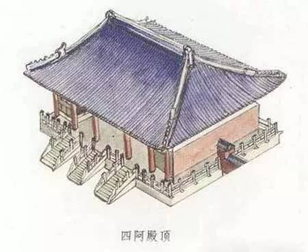 四阿殿頂也就是廡殿頂。四阿殿頂也是宋式叫法。“阿”是建筑屋頂?shù)那?,“四阿”就是四面坡式的曲檐屋頂。廡殿頂共有五條脊、四面坡,所以叫做四阿殿頂。