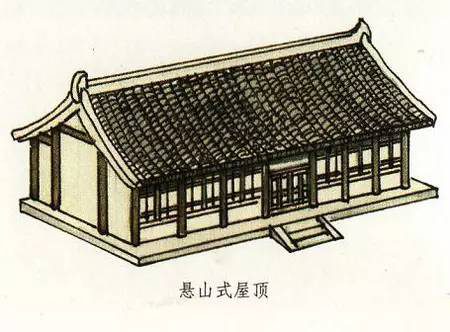 懸山式屋頂與硬山式屋頂一樣有一條正脊和四條垂脊。不過,它又有不同于硬山式屋頂那樣與山墻平齊,而是伸出山墻之外。這部分伸出山墻之外的屋頂是由下面伸出的桁(檁)承托的。所以懸山式屋頂不僅有前后出檐,在兩側山墻上也有出檐。懸山式是兩面坡屋頂?shù)脑缙谧龇?,不過中國古代的重要建筑基本沒有使用懸山式屋頂?shù)模貏e是唐代以前尤為少見。