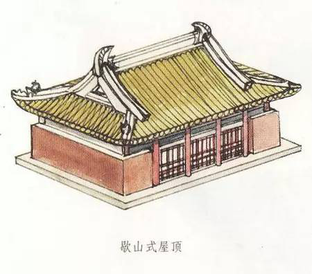 歇山是清式叫法,在清代之前它又有曹殿、漢殿、廈兩頭造等不同名稱。歇山式屋頂在具體形式上又有最基本形式的單檐歇山頂,以及變化形式的二層、三層或多層屋頂?shù)闹亻苄巾?,還有最上面的屋頂可以不設正脊而形成卷棚式的卷棚式歇山頂?shù)榷喾N形式。