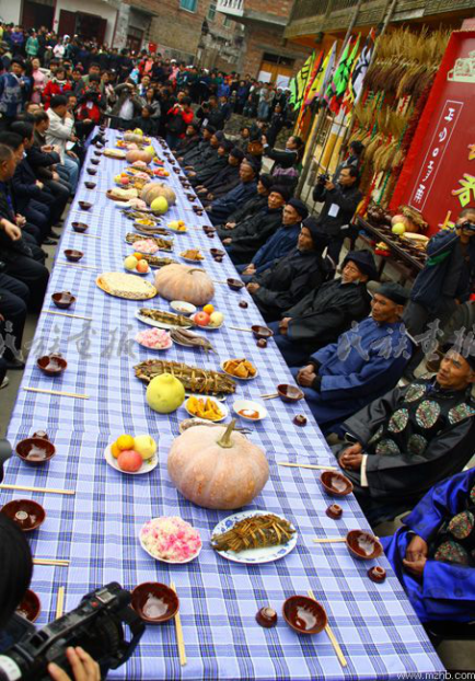 水族以大米為主食,喜愛(ài)糯食,此外,水族還種植一些小麥、包谷、小米、紅稗、紅薯及飯豆等雜糧作輔助糧。糯米飯是節(jié)慶主食,也用于祭祀,故又戲稱(chēng)“鬼米”。水果有李、橙、橘、桃、梨和楊梅,還出產(chǎn)麥冬、杜仲等各種藥材。水族農(nóng)民不善種菜,因而蔬菜品種比較單調(diào),青菜、廣菜及大葉韭菜是最常見(jiàn)的蔬菜。水族比較重視養(yǎng)殖業(yè)和漁業(yè)。水族酸湯極有特色,有辣酸、毛辣酸、魚(yú)酸、臭酸等多種。極少有炒菜,一年四季都吃酸湯“火鍋”。即使偶有豆腐、肉或魚(yú),也習(xí)慣加入菜中,煮成一鍋沾蘸水吃。吳茂釗《水族食俗點(diǎn)滴》一文指出,輪流坐莊就是熱情好客的文化表露。水族宴席上以雞、鴨、豬頭為尊,特別喜歡吃魚(yú)。水族特色飲食還包括水族特制的豬頭、豬腿、雞、鴨腿、糯米飯、粽粑、魚(yú)包韭菜、煮活魚(yú)等美食。對(duì)于水族人民而言,“吸煙重于喝茶,飲酒重于吃肉”。水族婚、喪、壽宴簡(jiǎn)易,有“吃酸”的習(xí)俗(圖為水族節(jié)日盛宴。席間的“魚(yú)包韭菜”是祭祖儀式的必備之菜。引自民族畫(huà)報(bào))。