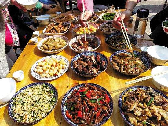 侗族一般習(xí)慣于清晨做好一天的飯菜,帶上山去食用。其中香禾稻做成的“摶飯”尤為甘美,有“一家蒸飯,全寨飄香”之說。侗族人喝的茶專指油茶,它是用茶葉、米花、炒花生、酥黃豆、糯米飯、肉、豬下水、鹽、蔥花、茶油等混合制成的稠濃湯羹,既能解渴,又可充饑。與飯、茶配套的,還有蔬菜、魚鮮、肉品、瓜果、野味、菌耳和飲料,食源廣博而異雜。