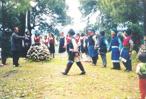 節(jié)日一大早,各家各戶便到供奉藥仙的樹林中,環(huán)藥仙的化身——一堆奇石或一棵古樹歌舞、供祭。隨后,人們各自相約成組,背籃荷鋤,唱著《采藥歌》,游山采藥。若遇到要采、挖的植物,小組中年歲最長的人,會在其根部先挖一鋤,然后停鋤唱起《盤歌》:這是一兜草,它叫什么草?用它治啥病?藥功好不好?隨之,挖藥者便從小到大,一人回唱一句作答:草名金錢草,采來加工變成寶,味苦、性涼用處多,肝病、尿阻少不了……之后,方采挖這棵藥草。