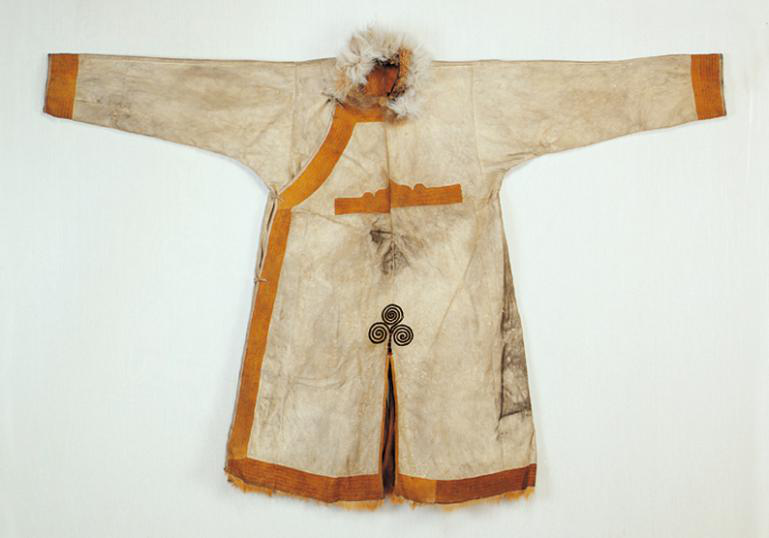 縫制衣服的針最初都是骨和木制的,將狍子的小腿骨加工成細(xì)骨簽,再在石頭上磨成骨針。據(jù)說(shuō)用落葉松的心木做成的針比骨針還硬??p制厚皮衣物時(shí),比如上鞋底,骨針和木針都扎不動(dòng),他們又用狍角制成角錐。頂針也是用獸骨制作的,鄂倫春族婦女縫制衣服時(shí)不像漢族那樣將頂針戴在中指上,拉線的時(shí)候針尖朝外。她們是將頂針戴在食指上,拉線的時(shí)候讓針尖朝自己,為的是避免扎到別人。獸皮服裝必須要用獸筋線縫紉。把涼干了的狍、鹿和犴筋,用木錘砸成綿軟的纖維,在搓成細(xì)細(xì)的線就可以使用了。用獸筋線縫紉的皮衣褲,即使剮壞了、磨爛了,卻始終不存在開(kāi)線的問(wèn)題(上圖為鄂倫春傳統(tǒng)服裝——狍皮袍,劉軍供圖)。