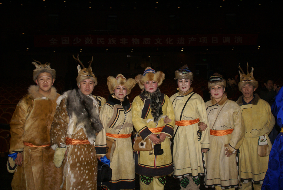 鄂倫春族的傳統(tǒng)服裝以袍式為主,冬季穿“蘇恩”?!疤K恩”是用冬季絨毛狍皮縫制的右任長(zhǎng)袍,小立領(lǐng),襟邊、下擺和袖口用黑色皮鑲嵌云卷花紋等邊飾,女袍還要作環(huán)肩裝飾。為便于奔跑和騎馬,“蘇恩”都有開(kāi)衩,衩口裝飾圖案豐富多彩。夏天穿用夏季沙毛狍皮制作的短袍或坎肩,布匹傳入以后穿布袍。 男子下身穿狍皮短褲,褲腿過(guò)膝,樣式如老式免襠褲,后來(lái)改穿長(zhǎng)褲。出獵時(shí)褲子上面還要穿套褲。套褲無(wú)襠,呈筒狀,上角釘有皮條,系在腰帶上。一般用夏季的狍皮縫制,因?yàn)橄募镜尼笃ぐ搴衲湍ィ灿杏寐蛊たp制的。婦女的褲子樣式比較獨(dú)特,長(zhǎng)至腳面,比男褲瘦些,腰兩側(cè)有開(kāi)衩,前面有兜肚,兜肚頂端釘皮條,系在脖子上。這樣的褲子,既保暖又便于騎馬,可以護(hù)住前心,又起到了乳罩的作用。講究的人還在褲子兩側(cè)和褲腳處繡上花邊圖案。
