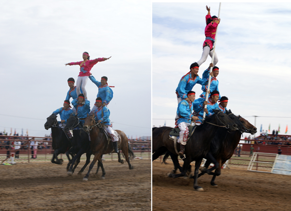 蒙古族的馬術(shù)表演非常精彩,有很多項(xiàng)目?!翱缭秸系K”是在運(yùn)動場跑道上每隔幾十米設(shè)置一個(gè)高1米的跨欄。跑道終端立著一個(gè)直徑約2米的火圈,矯健的坐騎從起跑線踏蹄起跑,越過跨欄,鉆過火圈直達(dá)終點(diǎn)。“乘馬斬劈”是在200-250米的距離之間樹起十幾個(gè)目標(biāo)。騎手們手持馬刀,疾馳如飛,經(jīng)過一個(gè)個(gè)目標(biāo)時(shí)舉刀劈砍,刀起標(biāo)落?!榜R上技巧”是由運(yùn)動員們在飛馳的馬背上做出各種造型動作。運(yùn)動員一般八九歲就要在馬術(shù)隊(duì)接受嚴(yán)格的訓(xùn)練。技巧表演可分單項(xiàng)和多項(xiàng),其中又包括單人單馬、單人雙馬、雙人雙馬和多人多馬。一匹飛奔的馬經(jīng)過騎手身邊,騎手可以突然抓住馬鬃翻身上馬,又會突然下馬腳尖點(diǎn)地再躍上馬背。其他技巧還有在馬背上“空翻倒立”“側(cè)方隱蔽”“樓里藏身”以及驚險(xiǎn)的“馬上疊羅漢”等表演【如圖,劉軍攝影,編者修剪合成兩圖】。