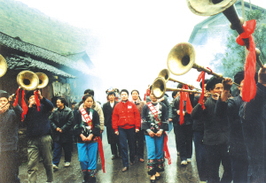苗族姑娘們,穿鑲花邊衣褲,圍繡花抹裙,扎花絲頭巾,配銀飾花帶,可真叫艷麗。我們這些遠(yuǎn)道而來的游客受到熱烈的迎接,姑娘們用古樸的攔門對(duì)歌為我們洗塵。攔門地點(diǎn)是在村頭的小橋邊,姑娘們拉著一排民族織錦帶,滿面春風(fēng)地等待客人,兩邊苗鼓、獅子、嗩吶、甲馬長號(hào)夾道歡迎。儀式按苗族風(fēng)俗,由苗族姑娘們先唱熱情的迎客苗歌,再請(qǐng)客人唱歌作客,對(duì)歌三次方過攔門第一關(guān)。緊接著她們又捧出大碗苞谷酒向客人們一一敬酒。熱情好客的姑娘們一定要待客人喝了香醇的美酒后,才示攔門結(jié)束。然后,又一路鞭炮,一路號(hào)角吹吹打打,把我們請(qǐng)進(jìn)苗寨。