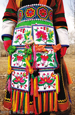 土族已婚婦女頭戴“扭達(dá)”(頭飾),身穿五色花袖衫,外套藍(lán)、黑色坎肩,勒花腰帶或褐帶,穿緋紅裙子,著繡花長(zhǎng)腰布鞋;未婚姑娘則不戴“扭達(dá)”,不穿緋紅裙子,頭發(fā)不挽髻,只梳兩條小辮子,中間梳大辮子,三條辮子合辮成一條,用紅頭繩扎緊,上系兩枝小海螺;老年婦女只梳兩條辮子,辮梢系在一起,垂在背后,只戴卷邊氈帽,一般不戴“扭達(dá)”,不穿花袖衫,也不穿緋紅裙子,腰帶以黑布為多。