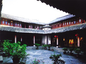 云南大理市喜州“四合五天井”院落。白族將一幢三開間二層的房屋稱為“一坊房子”。一坊房子是普通百姓最常見的住房,即底層三間一明兩暗,明間為堂屋,安設(shè)六扇花格門。兩側(cè)次間為臥室,設(shè)單扇門和格扇窗,前面有臺(tái)階和寬敞的廈廊。樓上三間敞通,一般不隔間,依房柱分區(qū)域,面對(duì)天井設(shè)格扇窗。中間明間靠后墻設(shè)神龕,里間當(dāng)書房,放書柜和書桌,人口多的也放床當(dāng)臥。