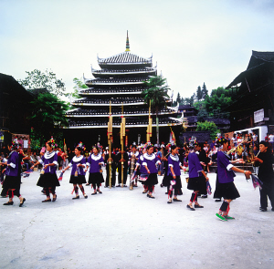 侗寨鼓樓前的表演。侗家把鼓樓當(dāng)做遮蔭樹,既是侗寨的象征,也是氏族的標(biāo)志。因此,所有鼓樓都是全寨人集資、出力興建的,大一點(diǎn)的村寨按居住范圍會建幾座鼓樓。