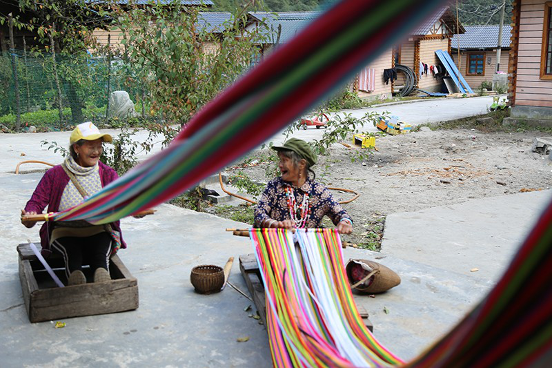 習總書記接見后,李文仕(左)回村繼續(xù)織起獨龍?zhí)?。如今獨龍?zhí)阂殉蔀楠汖埮匾膭?chuàng)收來源