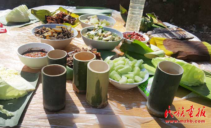 基諾族地區(qū)食材豐富,一日三餐,以大米為日常主食,雜以玉米、瓜豆等。每年5—9月的雨季,基諾山漫山遍野是食材,山藥、水芹菜、竹筍、魚腥草及各種菌類等無(wú)污染且很新鮮,是難得的烹飪材料,經(jīng)過(guò)簡(jiǎn)單處理就成為餐桌上的美味佳肴?;Z族民間有句俗話,叫“漢炒、傣蘸、基諾舂”,也就是說(shuō)漢族人喜歡吃炒菜,傣族的菜喜歡蘸著調(diào)料吃,基諾族的菜則以臼舂為主?;Z族的肉類的吃法較多,可以腌成干巴,也可吃新鮮的。酸腌魚、涼拌茶也是基諾族的最愛,基諾人做飯就餐均在竹樓二層的火塘周圍進(jìn)行,有一定的禮節(jié)和講究。基諾族吃飯時(shí),主人首先要在火塘東側(cè)獻(xiàn)一點(diǎn)飯菜祭祀祖先和灶神,吃飯時(shí)全家人按順序在火塘旁圍蔑桌而坐,家長(zhǎng)正對(duì)火塘,客人靠火塘而坐。