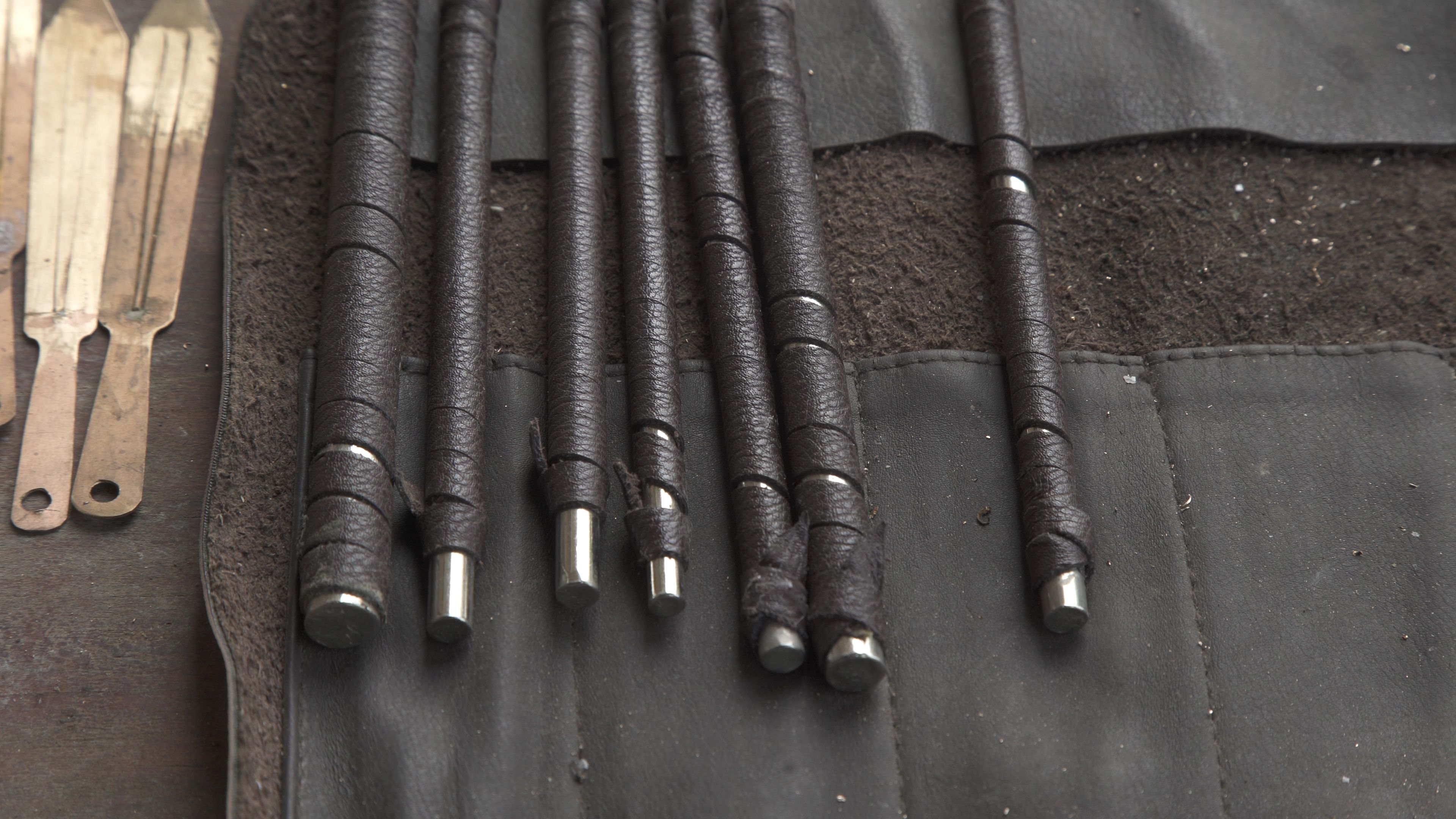 圖片說(shuō)明:貴州貴陽(yáng)清鎮(zhèn)市流長(zhǎng)鄉(xiāng)腰巖村苗族制作口弦所需工具-鑿子