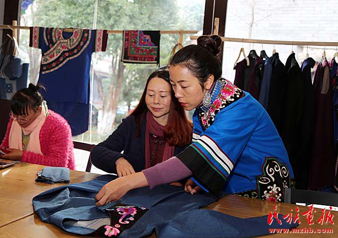 大姚縣咪依嚕民族服飾制品有限公司總經(jīng)理羅珺給職工講解彝族服飾文化
