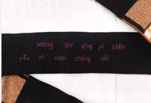 在北京服裝學(xué)院民族服飾博物館藏的這條白褲瑤男子盛裝腰帶的背面,就繡有“相識情義深,友誼春常在”的拼音,也許就是一對白褲瑤青年男女的愛情密碼。