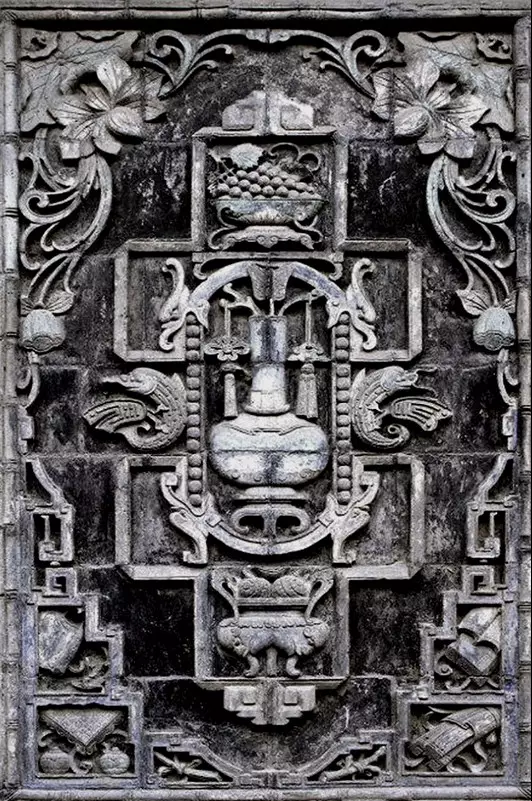 清代,北京紫禁城宮廷內墻面夾柱的通氣孔也都使用磚雕,鏤雕花鳥圖案,牢固磚雕 而美觀,且利于空氣流通。