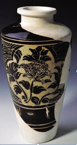 西夏是兩宋時(shí)期割據(jù)于我國(guó)西北地區(qū)的一個(gè)地方政權(quán),黨項(xiàng)族統(tǒng)治者積極效仿宋朝的禮儀文化,在制瓷業(yè)方面受鄰近山西、陜西等地瓷窯工藝的影響,燒制出了兼具中原與西北地方特色的瓷器。所謂西夏經(jīng)瓶,就是這類瓷器的代表器型?,F(xiàn)存西夏經(jīng)瓶,均為寧夏靈武磁窯堡窯址出土,雖然多為殘破器,但從復(fù)原器型看,其造型特征為小口,束頸,寬肩,修腹,暗圈足,與中原同類器物形制基本相似,但紋飾及裝飾手法上也有一些地方特色。寧夏博物館館藏此類西夏經(jīng)瓶30余件。