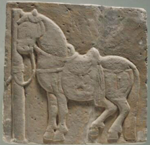 邊長30.5厘米,厚5厘米,呈正方形。配有鞍具和轡具,韁繩系在拴馬柱上。馬取立姿,似在歇息。馬首微頷,雙耳直立,頸部粗壯,身體肥碩,前腿挺直,后腿微曲,長尾及地。雕刻手法簡(jiǎn)練,平實(shí)而質(zhì)樸。
