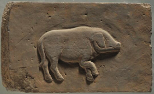 長30厘米,寬18.5厘米,厚5厘米,呈長方形。畫面中央為一只側(cè)身的小豬。小豬形象逼真,一只前踢抬起,體態(tài)肥碩,造型可愛,刻畫精細(xì)。