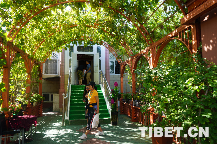 除了古老的純木質結構民宿,喀贊其還有各式磚石結構的民居。院落寬敞明亮、華麗氣派,家家種植著花草、蔬菜,郁郁蔥蔥、生機盎然,葡萄廊架已成為每家的“標配”,葡萄架下是家人休閑、朋友聚會的地方。圖為當?shù)孛窬釉簝取?/p>