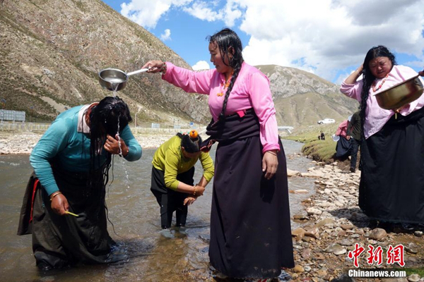 37歲的藏族青年旦增跟記者開(kāi)玩笑,“自己看上去比實(shí)際年齡年輕,就是因?yàn)槟昴甓紒?lái)沐浴?!彼X(jué)得藏族民眾初秋過(guò)“沐浴節(jié)”,能夠提高抵抗力,與內(nèi)地所講的“春捂秋凍”本質(zhì)相同。旦增介紹說(shuō),不能在流水中過(guò)“沐浴節(jié)”的藏族民眾,會(huì)在月光照過(guò)的盆中凈水洗頭。