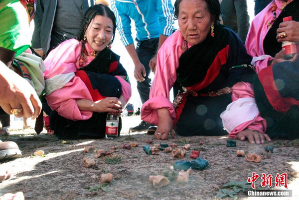 圖為青海省玉樹(shù)藏族自治州民眾玩貼改(骨節(jié))來(lái)慶?!般逶」?jié)”的到來(lái)。來(lái)源:中新社 攝影:孫睿