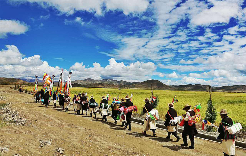 節(jié)日的第一天早晨,當(dāng)陽光撒滿金黃麥田的時候,農(nóng)民們手持麥穗圍著農(nóng)田轉(zhuǎn)圈游行,最前邊是由喇嘛和老年農(nóng)民組成的儀仗隊(duì),高舉佛像,背著經(jīng)書,吹著佛號,感謝上天給人們帶來了風(fēng)調(diào)雨順的好年成。轉(zhuǎn)完麥田以后,照例要在廣場上舉行群眾性文娛體育活動,其中有藏戲、歌舞、跑馬、射箭、拔河等,十分熱鬧。這天,家家戶戶都要準(zhǔn)備充足的酒食,穿上最漂亮的衣服,或者在廣場四周的草場上野餐,或者在村子里邀集親朋好友宴飲。青年男女則喜歡在晚上圍著篝火跳舞,對唱情歌,直到深夜。