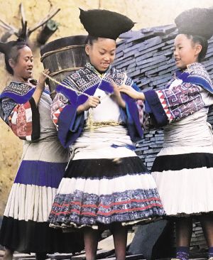要論“疊穿”的數(shù)量之最,則當(dāng)屬貴州大方縣顯母村的苗族女性了。與苗族慣用銀飾的固有印象不同,這里的苗族女性鮮以銀為飾,她們用數(shù)量極為可觀的服飾“疊穿”來(lái)彰顯富裕。節(jié)日里,顯母村的苗族女性換上盛裝——數(shù)條百褶裙系在腰間,塑造出豐腴的臀部造型,內(nèi)層裙子素凈無(wú)花,外層裙子則布滿條帶狀蠟染裝飾。在這個(gè)難得的大型社交場(chǎng)合,未婚女孩通過(guò)“疊穿”后的獨(dú)特造型來(lái)展示自己的魅力,衣物的數(shù)量和精致程度成為了吸引異性、獲得肯定的重要標(biāo)準(zhǔn)和獲得美好婚姻的重要條件。到了婚禮時(shí),女性所著裙子的數(shù)量更是可達(dá)35條?;楹?,她們要在裙邊加上一圈深色邊飾以作標(biāo)識(shí)。