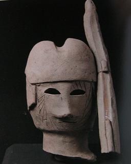 埴輪,為日本特有的器物。埴輪放置在古墳封土表面,即為前方后圓墳中“方”的地方。埴輪分為筒形埴輪,來源于陶器;還有形象埴輪,細(xì)分為器物和人物。埴輪來源于中國古代墓室中陪葬的陶俑,或古代帝陵神道上的石獸石人。某些埴輪人物有文面,并填墨(圖十六),推測當(dāng)時的日本出現(xiàn)了文面現(xiàn)象。