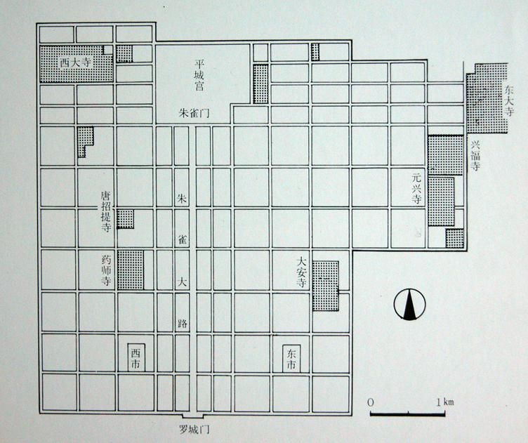 平城京在規(guī)模上繼承了藤原京,面積大致相同,東西約5.9km、南北約4.8km,其形制主要模仿唐長安城。全城平而呈長方形,宮城在北部中央。南面正中設(shè)象征性的都城正門——羅城門。羅城門與宮城的朱雀門相對,朱雀大路縱貫?zāi)媳保L約3.8km,寬72m。而此朱雀大路正好將全城分為東西兩部分,分別稱左京和右京。京城內(nèi)有里坊與商市(即東市和西市)。這些設(shè)置和街道的名稱都和唐長安一模一樣,但總體面積僅為唐長安城的四分之一(圖二十一)。