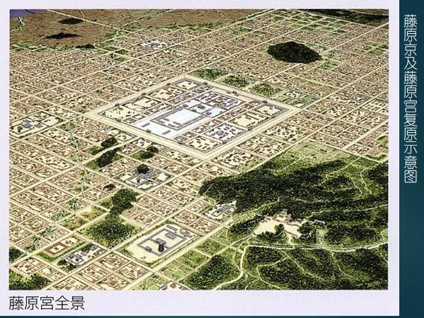飛鳥-奈良時代對作為中央集權(quán)國家的象征的都城建設(shè),極其重視。藤原京是持統(tǒng)、元明、元正三代天皇延用了16年的都城遺址,這個遺址經(jīng)過幾十年的考古發(fā)掘,已經(jīng)探明了藤原京和藤原宮的范圍及布局(圖二十)。京城東西及南北各長5.3km,平面近正方形,宮城在其中央,這點(diǎn)與唐長安城不同。有學(xué)者認(rèn)為,藤原京是以《周禮》規(guī)定的理想化都城建制為依據(jù)所筑成的。