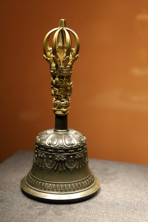 持驗法器單元主要展示修持佛法、舉行佛事活動和佛教儀式時所用的法器,包括金剛鈴、金剛杵、嘎巴拉碗、嘎巴拉鼓、嘎巴拉念珠、喀章嘎、金剛橛、鉞刀等。本部分所選法器多為藏傳佛教密宗修行所用,因多存于庫房,已不在原佛堂陳設(shè),其用途和使用場所便難以知悉。故宮中有許多佛堂,大多是乾隆時期建造,其中很多是密宗佛堂,如雨花閣、梵華樓、梵宗樓、養(yǎng)心殿西暖閣佛堂等。
