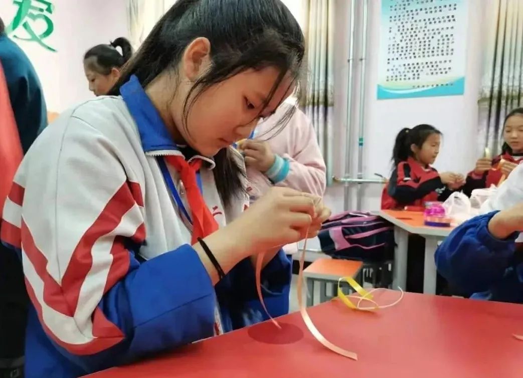 葛玉英說:”芨芨草手工編織品主要有簍、筐、盒、盤、茶墊、時(shí)尚包等生活用品,色彩以白、藍(lán)為主,圖案以白云紋、曲字紋為主,以針繡法結(jié)合草編中的平編、絞編、編花、纏邊、擰編等技法進(jìn)行編織。在實(shí)際教學(xué)中,為了方便,我用彩帶代替芨芨草,讓芨芨草編織技藝在孩子們的濃厚興趣中得到傳承,既提高了學(xué)生的動(dòng)手能力,也提升了學(xué)生的審美思維和審美能力,同時(shí)增強(qiáng)了學(xué)生對(duì)本土文化的自豪感和自信力?!?/p>
