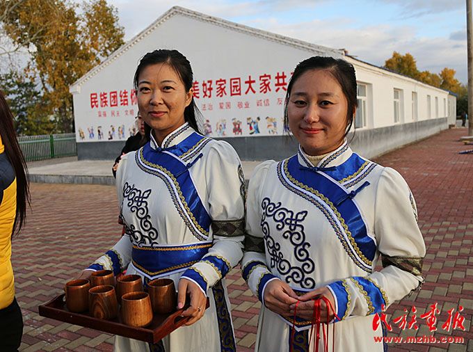 黑河市愛輝區(qū)坤河達(dá)斡爾族滿族鄉(xiāng)的達(dá)斡爾族群眾發(fā)展鄉(xiāng)村旅游。圖為村民用奶茶迎接賓朋。