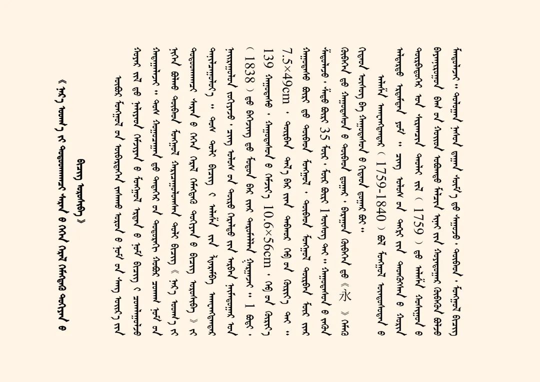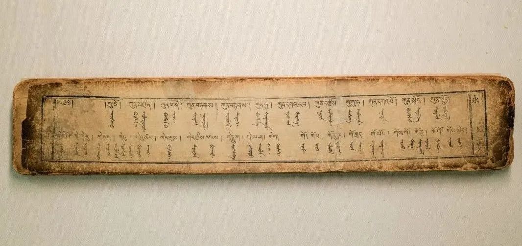 藏蒙對照詞典《詳解月光辭典》又稱《浩月輝映詞典》,該詞典由阿拉善拉隆巴阿旺丹德爾編著,清道光十八年(1838)北京嵩祝寺木刻本。1卷,139葉,頁面尺寸10.6×56厘米,版框尺寸7.5×49厘米,四周雙欄,梵來裝。每頁以藏蒙、藏蒙四行為階梯排列,每列35行,每行1字。頁面左側有藏文頁碼,右側有漢字《永》和漢文頁碼。
