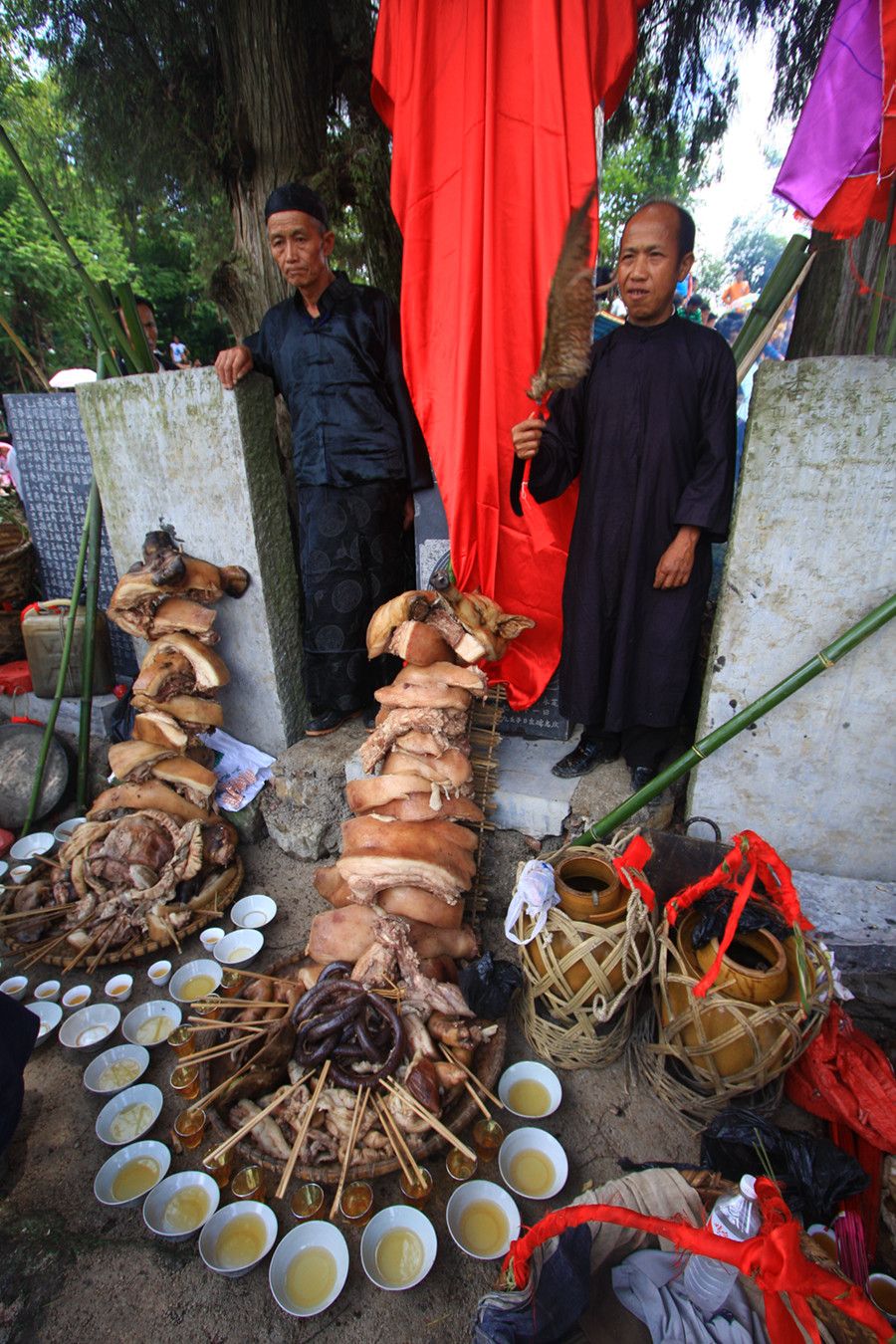 人們傳說只有醉倒了"霞神",它才能永遠留在這方,才能使這里風(fēng)調(diào)雨順。當(dāng)水書先生念了最后的咒詞,祭典才在鼓樂聲和歡呼聲中結(jié)束。最后,各族系將祭肉一并聚攏,聚餐慶祝。天黑之后,人們秘密地將"霞神"收藏起來,至此,"敬霞"活動全部結(jié)束。